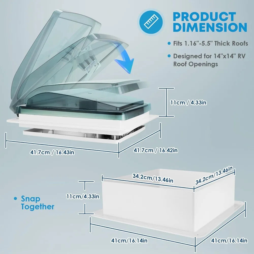 EASE OF INSTALLATION: The rv ceiling fan fits all standard 14" x 14" roof openings. The camper exhaust fan includes screws and EXTRA SEALING TAPE for easy installation, and comes with a removable mosquito-proof screen.