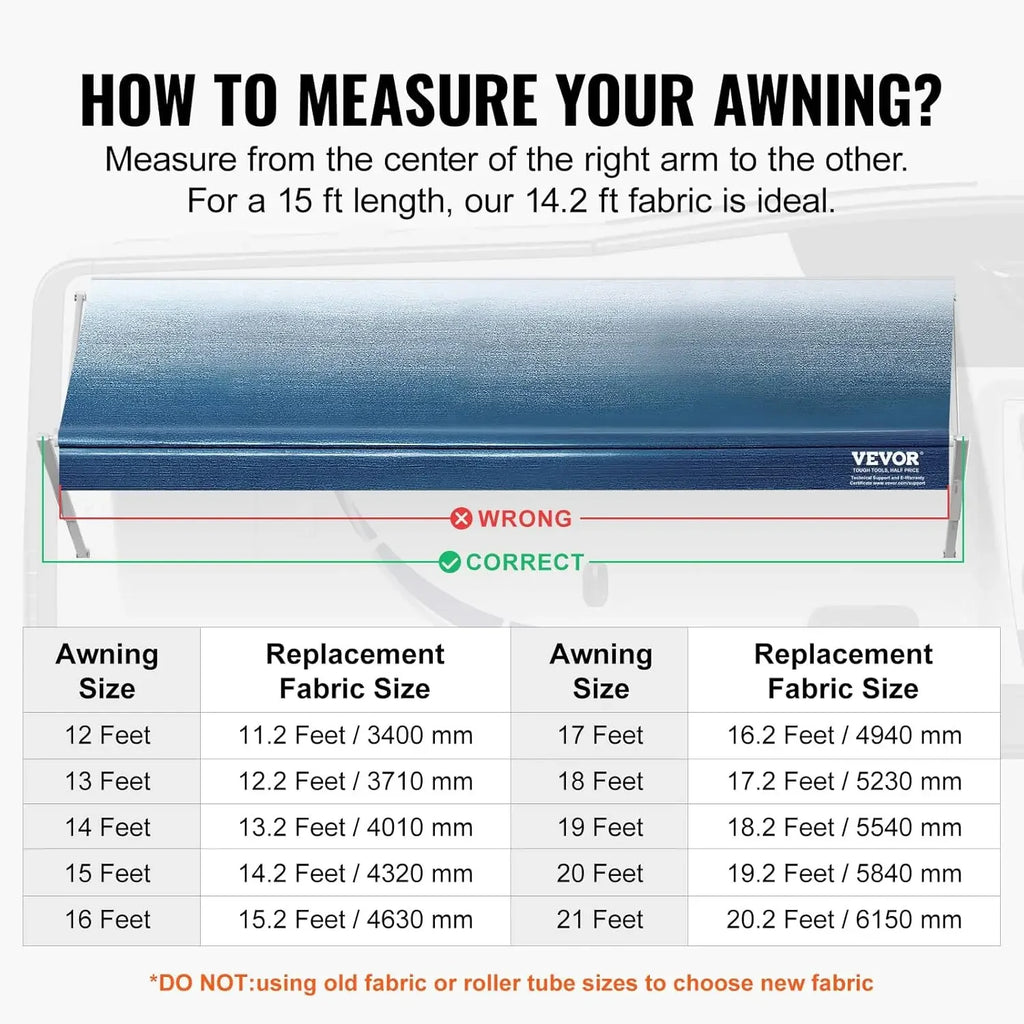 • Versatile Size Options: Our 14.2 ft length awning fabric replacement is designed for 15 ft awnings and is compatible with various awning types. To ensure a perfect fit, measure the distance from the center of the left support arm to the center of the right support arm on your V roller before selecting your awning fabric size. Avoid using old fabric or roller sizes as a reference to prevent installation issues.