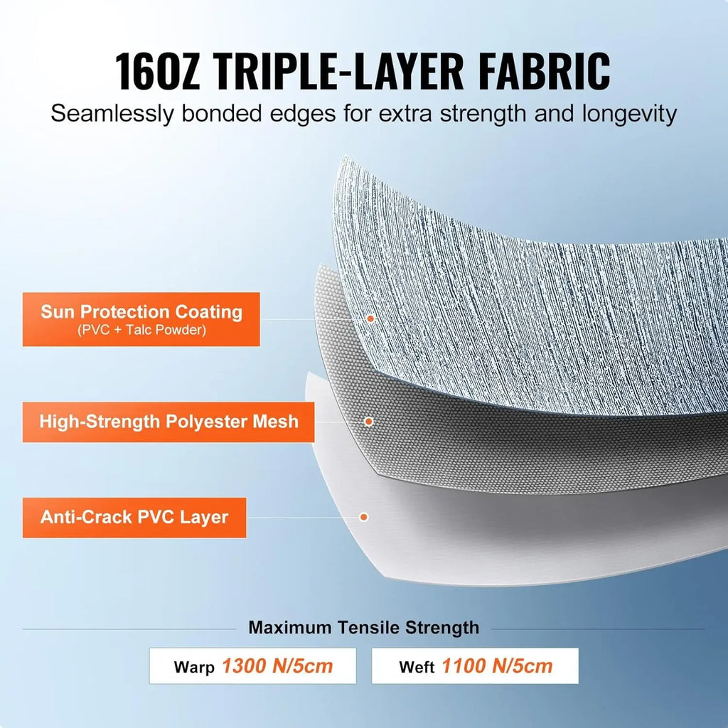 • 16oz Durable Material: Constructed from a triple-layered PVC fabric, this V awning fabric features an outer layer mixed with PVC and talc for sunscreen protection, a middle layer of high-strength polyester wire mesh for durability, and an inner PVC coating. This composition ensures resistance to fading, ease of cleaning and breathability. It's built to endure sunlight exposure, rain, and even washing machine cycles.