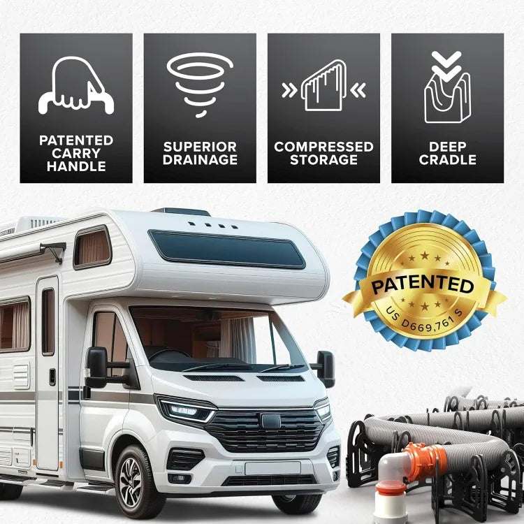 Fits 20' Camper Sewer Hose: Say goodbye to hose slipping and closing issues. This innovative product securely holds a 20' RV sewer hose with a 3" diameter without slipping. Deep cradles keep your hose from creeping closed.