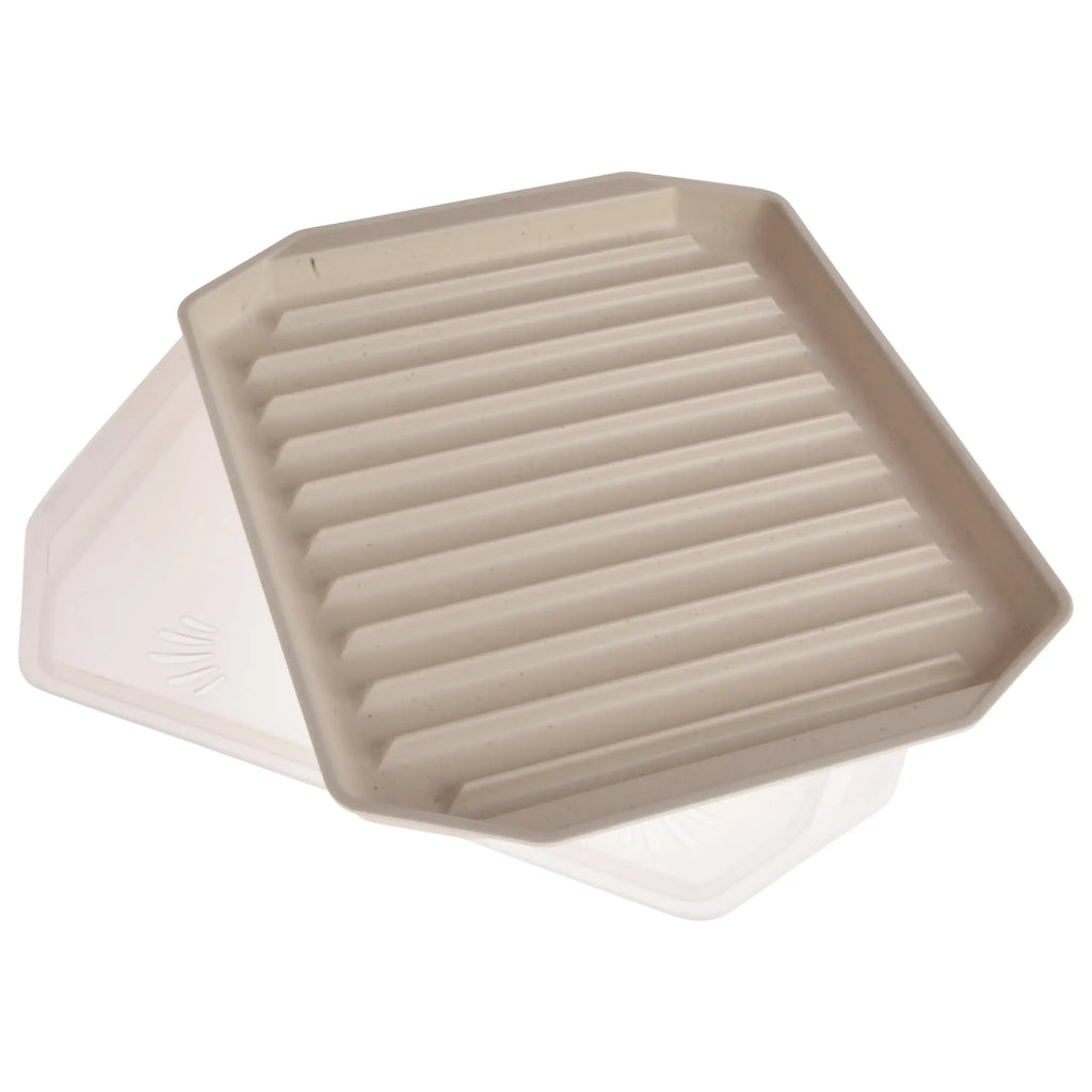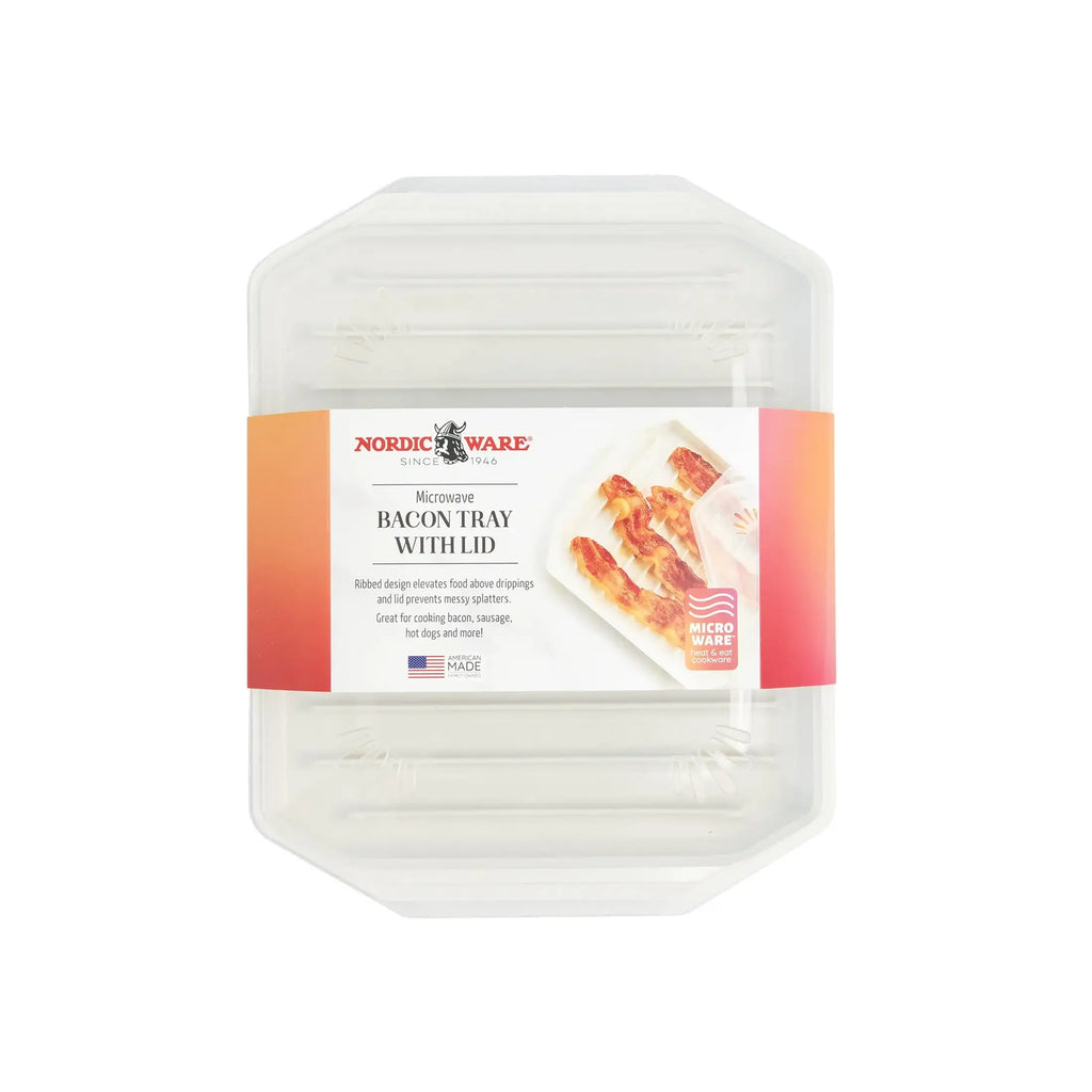 Prevent the greasy mess of making bacon the traditional way by using the covered bacon rack in the microwave for mess free and quick cooking. The covered bacon rack has a compact design that fits in even the smallest microwaves. The clear lid prevents messy splatters and the ribbed design elevates food above the drippings so the grease flows away. Great for cooking bacon, sausage, hot dogs as well as heating leftovers and defrosting foods.