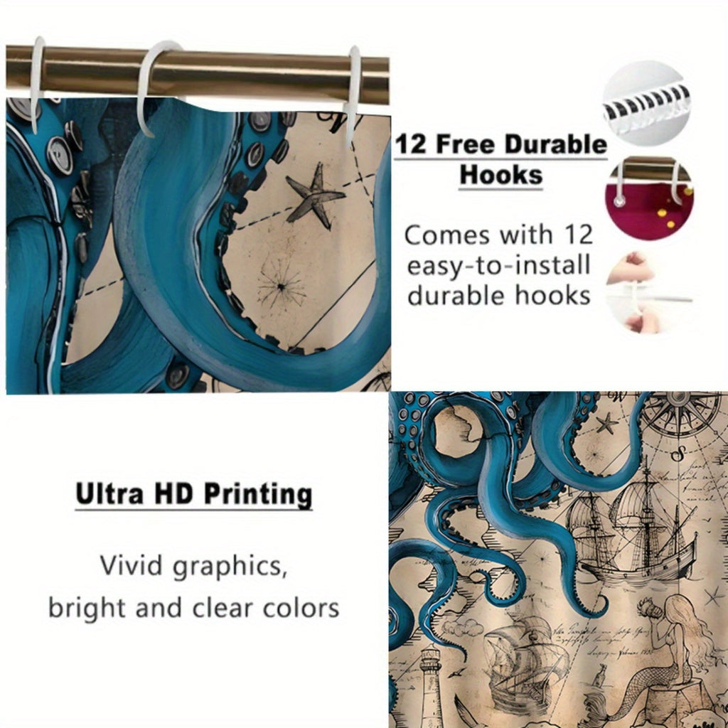 Nautical-Themed Octopus Polyester Shower Curtain -  Ship & Mermaid Home Decor, No-Drill Installation, Machine Washable, All-Season Bathroom Divider with Hooks, Bathroom Decor And Accessories