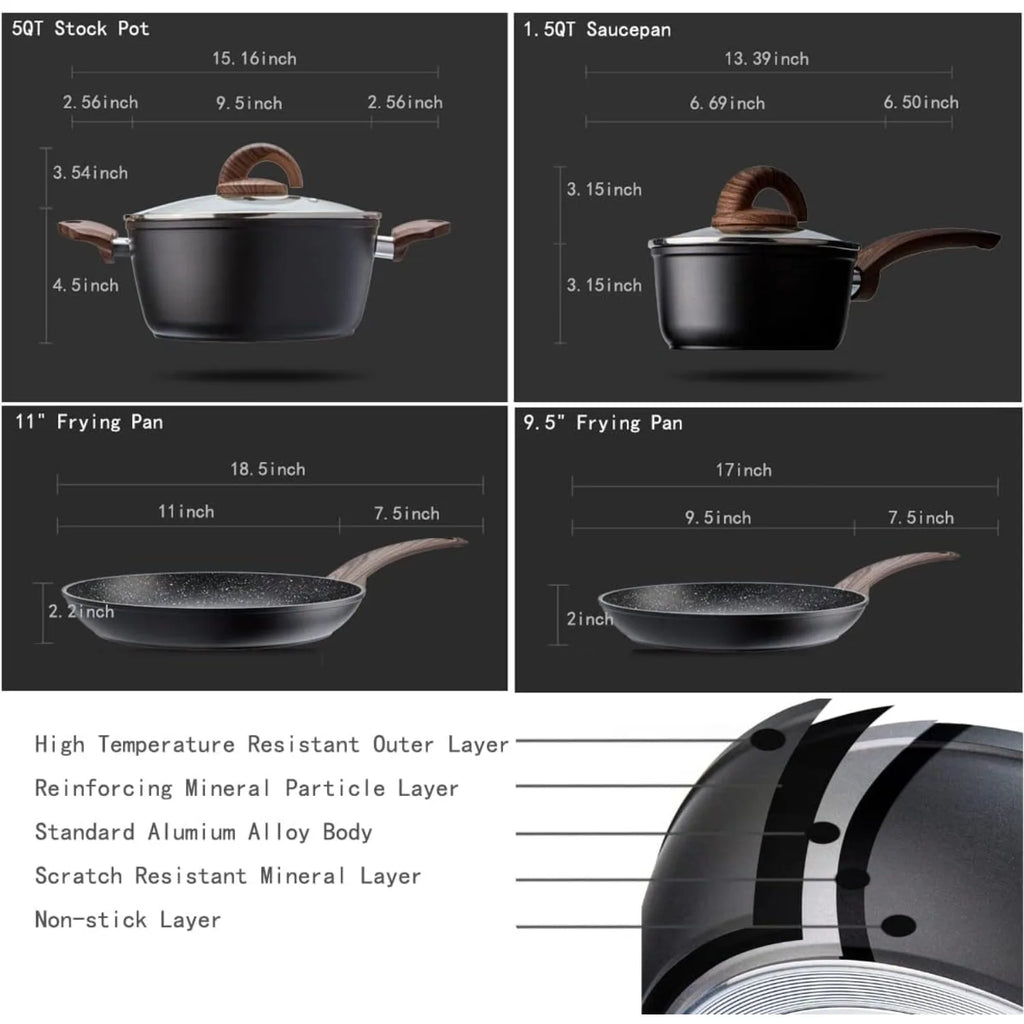 • Enjoy a tasty and safe cooking experience with the 6-piece cookware set. The set includes a 9.5" frying pan, 11" frying pan, 1.5-quart sauce pan with Lid, 5-quart stockpot with Lid. Made with non-toxic ceramic and free of harmful chemicals, this set contains all the tools you need to fry, sear, roast, and simmer your favorite dishes without worry. Plus, It's also specially decorated with patterns to make your kitchen blend with nature;