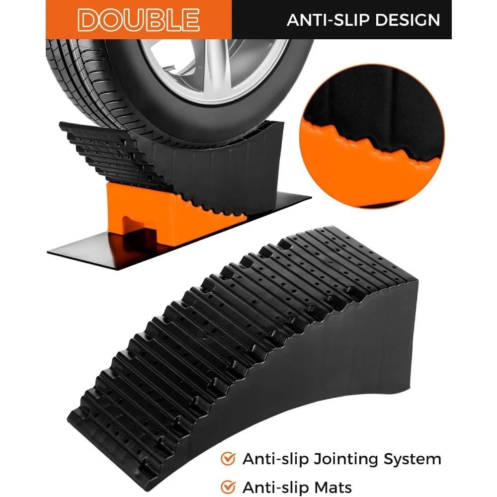 [DOUBLE ANTI-SLIP DESIGN] Upgraded the design of the non-slip gripper with precise gearwheel mesh system on the curved levelers and chocks surface to increase friction.Also comes with two anti-skid pads,add anti-slip jointing system for better fitting to further ensure that camper leveler system does not slip
