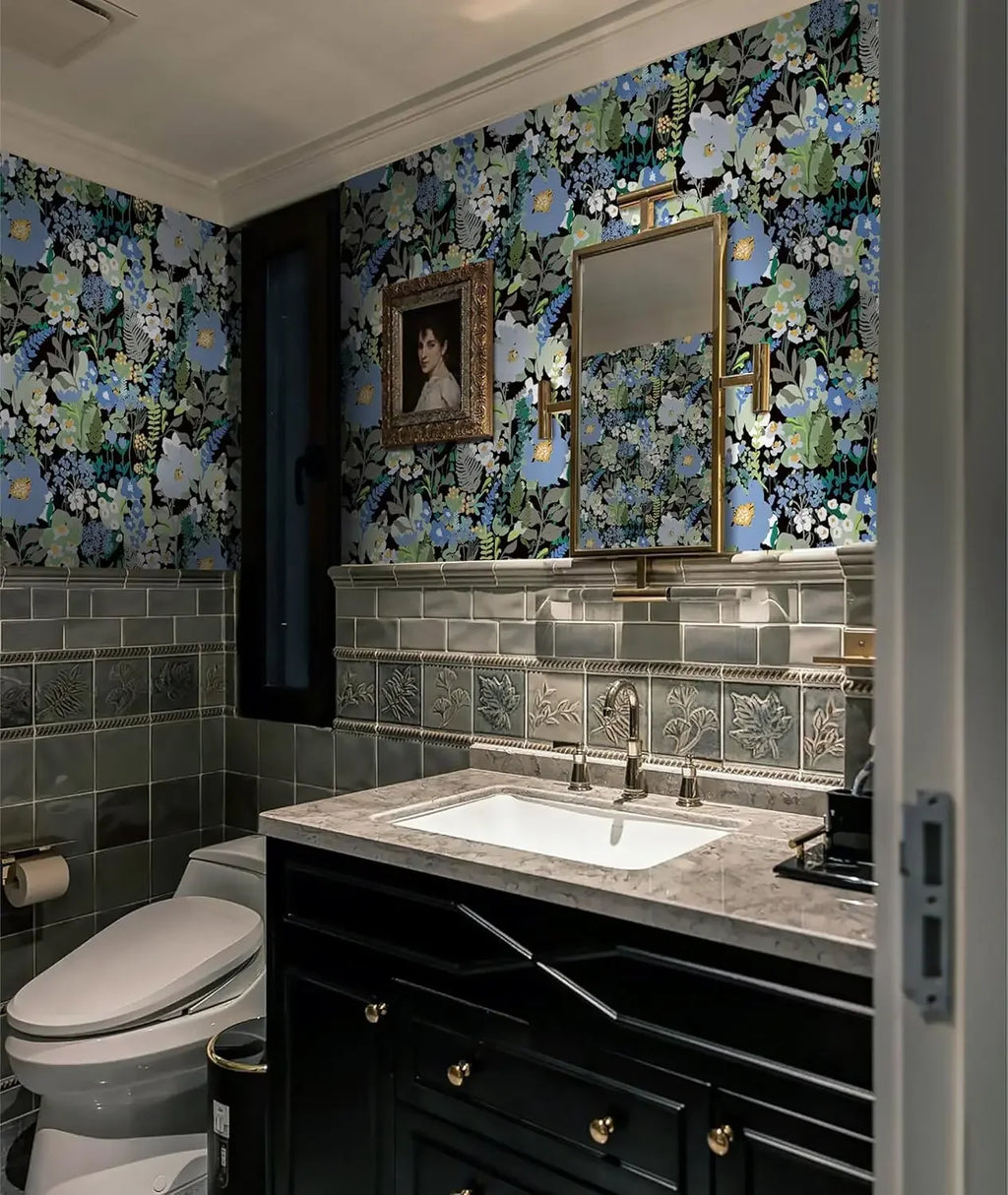 • Design:Peel and stick wallpaper floral blue wallpaper is vintage style floral wallpaper, its background is black, pattern consists of two blue flowers and depicts many other flowers and different shapes of leaves, rich in, a variety of flowers and leaves intertwined and growing.