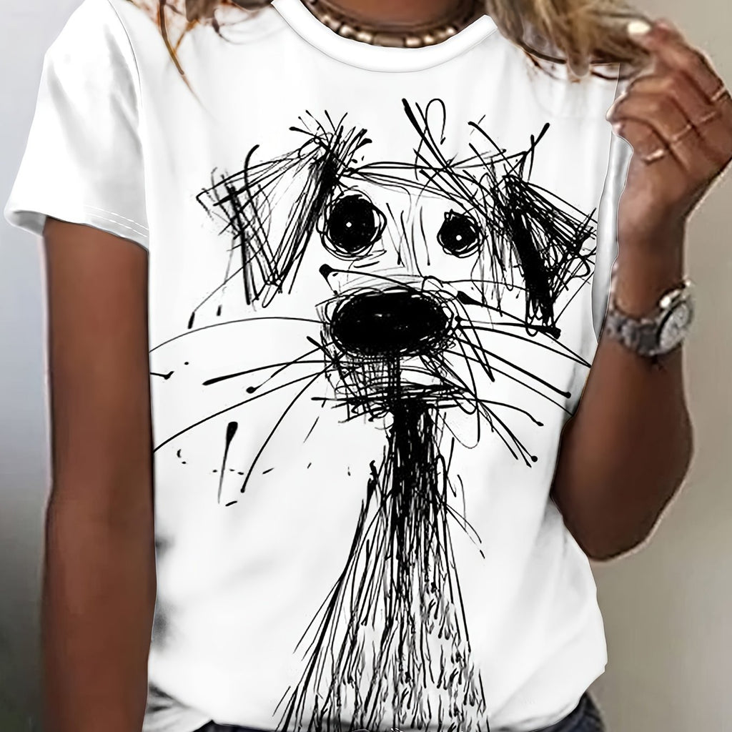 Women's Soft Breathable T-Shirt - Black & White Doodle Dog Print Lightweight Summer Casual, Machine Washable, Comfortable Everyday Casual Attire, Trendy Graphic Tee for Women